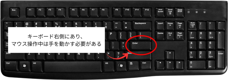 しかし、Enterキーはキーボードの右側にあるため、マウス操作中は位置的に押しにくいです。