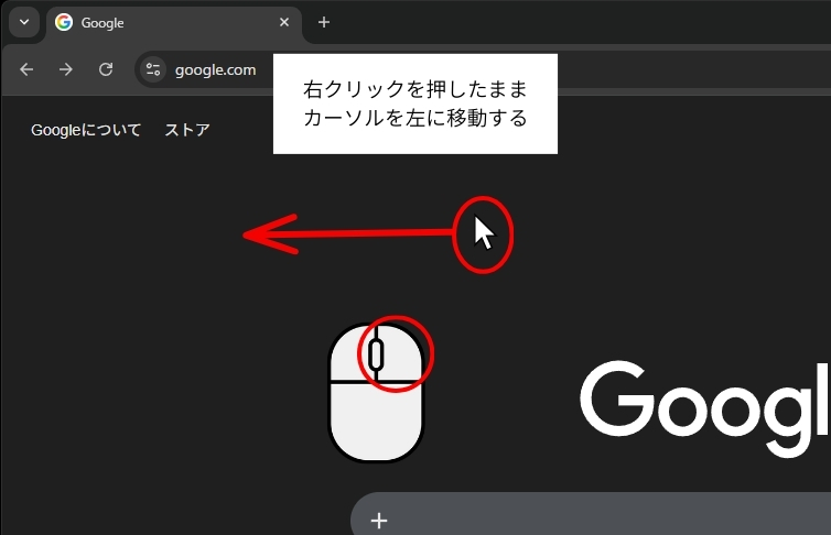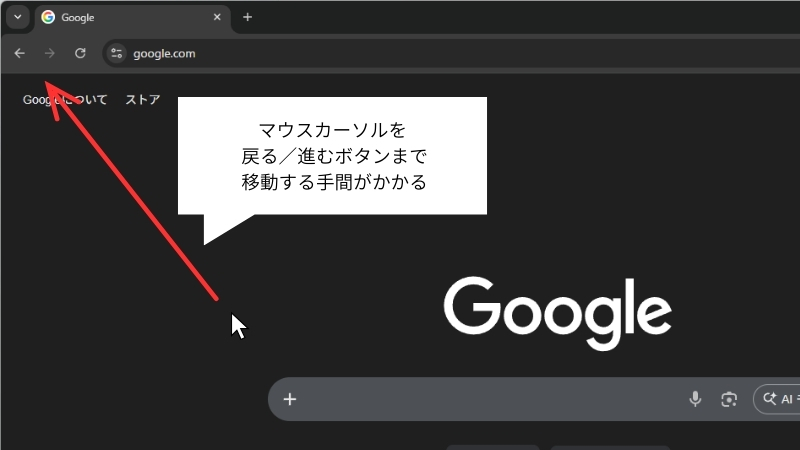 ブラウザの戻る・進むボタンをクリックするためにマウスカーソルの移動に手間がかかる様子を表した画像